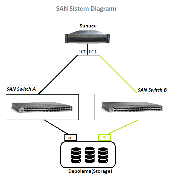 SAN sistemleri, Uygulama sunucuları ve depolama sistemleri arasında hızlı ve güvenilir erişim alt yapısı vasıtasıyla depolama sistemlerini ve uygulama sunucularını bir ağ üzerinden birbirine bağlayan bir depolama mimarisidir.
